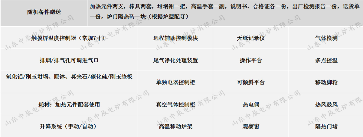 加熱元件兩支,棒具兩套,坩堝鉗一把,高溫手套一副,說明書、合格證各一份,出廠檢測報告一份,送貨單一份,爐門隔熱磚一塊(根據(jù)爐型配訂) | |||||